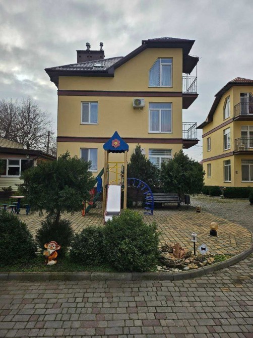 Ухоженая территория с десткой площадкой, зоной барбекю, вечнозелёными растениями