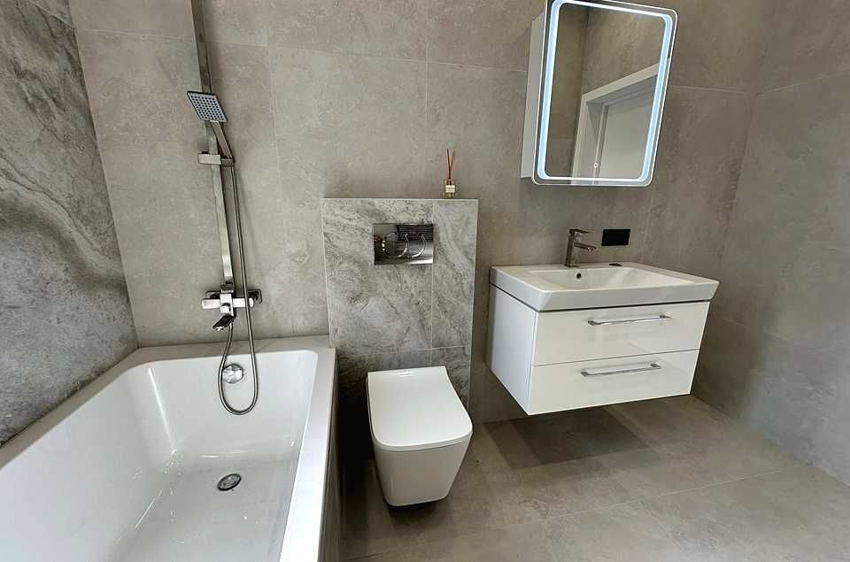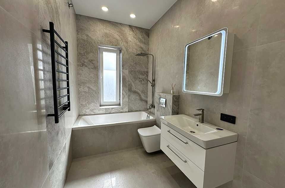 У ванній – простора ванна. Гостьовий санвузол/технічна кімната викладений платкою, тут встановлено об’ємний бойлер, а у вітальні – кондиціонер для комфортного мікроклімату.
