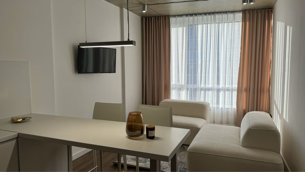 Оренда стильної 1 к кв з кухнею студією в новому будинку ЖК "Файна Таун" в Шевченківському районі, вул. Салютна, 2 Квартира 43 м2 , розташована на четвертому поверсі та складається з передпокою, спальні, великої кухні -студії та санвузла. Вікна квартири виходять в двір. Облаштована всіма необхідними меблями з екологічно чистої деревини та оснащена побутовою технікою: телевізор Samsung Smart 43, кондиціонери в кухні та кімнаті, плита індукційна, вбудований холодильник, духова шафа з функцією мікрохвильової печі, пральна машина з сушаркою. В кухні та ванній кімнаті тепла підлога, високошвидкісний інтернет. ЖК "Файна Таун" це: закрита територія з входом по картці, цілодобова охорона, відеоспостереження, паркінг, підземні контейнери для сміття, зарядні станції для електромобілів та лавки з інтегрованими батареями для підзарядки девайсів, розумне освітлення, яке підлаштовується під час доби та ще багато чого для того, щоб жити з комфортом й ні в чому себе не обмежувати) розповім при перегляді. Зручне транспортне сполучення та розвинута інфраструктура: магазини,спортивні та пішохідні зони ,зона барбекю, ресторани та кафе. Квартира, в якій поєднані комфорт та затишок, шукає своїх порядних орендарів молоду пару або одну людину без дітей та тварин. Перша оренда, квартира вільна.