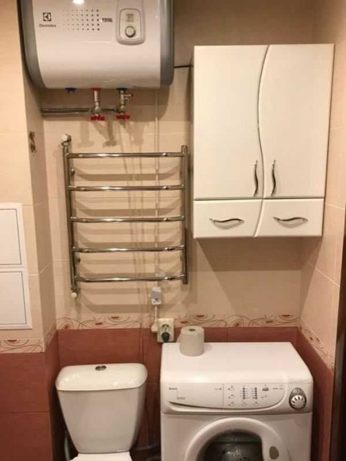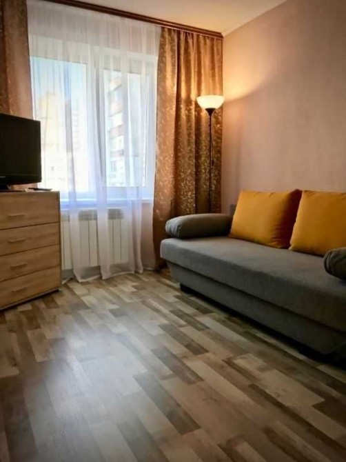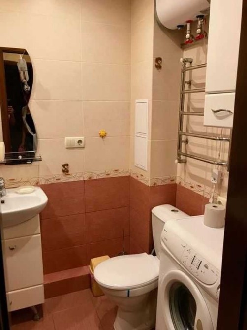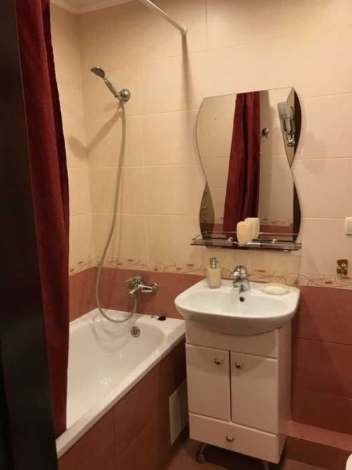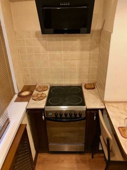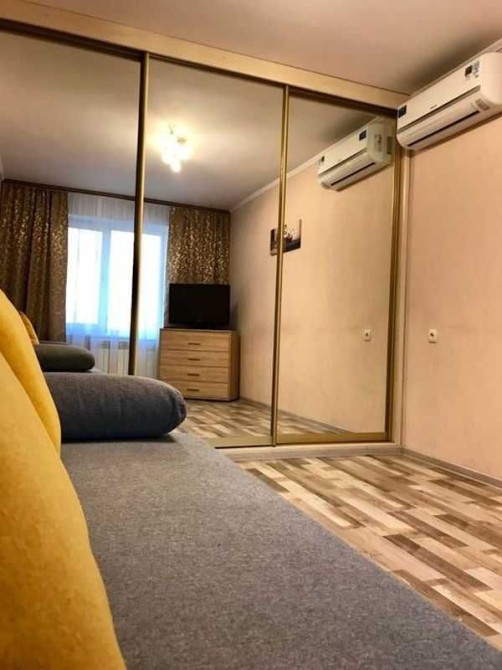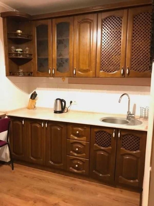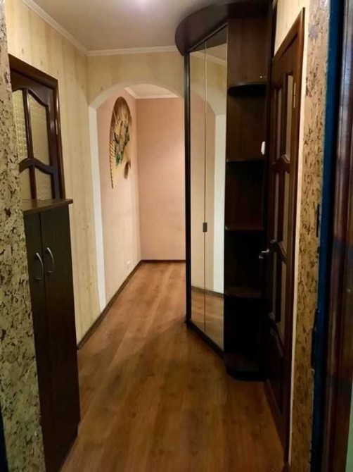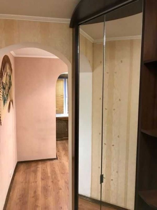 У кімнаті - велика дзеркальна шафа-купе, диван, комод. У коридорі - кутова шафа для верхнього одягу та ще один комод. Ванна та туалет суміжні, з якісною сантехнікою. Кухня дерев’яна, збільшена за рахунок балкона.