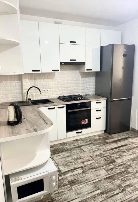 Сучасна однокімнатна квартира з світлою кухнею-студією, повністю оснащена для комфортного життя.