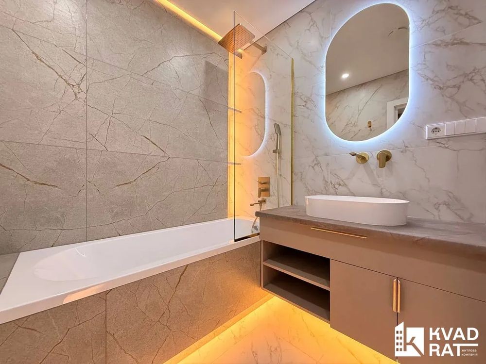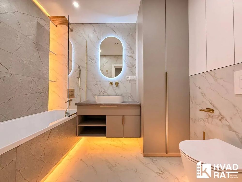 Інтерєр виконано у стриманій сучасній палітрі з використанням якісних матеріалів кварц-вініл, керамічна плитка, фарбовані стіни, продумане LED-освітлення.