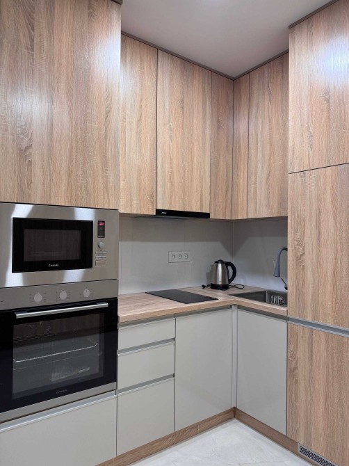 • Вмонтована кухня з побутовою технікою: холодильник, духова шафа, мікрохвильова піч