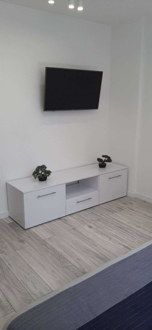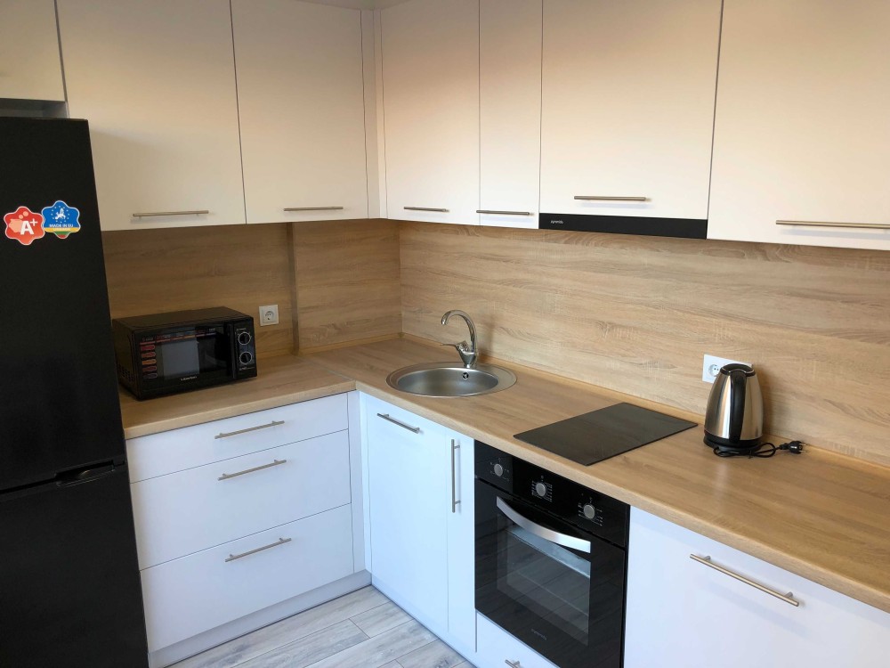 Квартира повністю укомплектована меблями та технікою (телевізор - SMART TV, інтернет, кондиціонер, холодильник, мікрохвильова піч, скляна варильна поверхня, витяжка, духова шафа, диван який трансформується в спальне місце, велика шафа-купе, гардеробна та вбиральня).