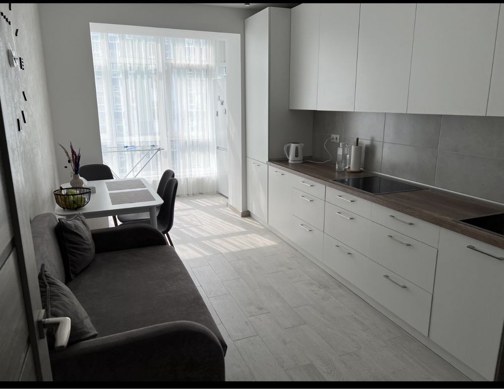 Оренда стильної 1 к кв з кухнею студією в новому будинку ЖК "Файна Таун" в Шевченківському районі, вул. Салютна, 2 Квартира 43 м2 , розташована на четвертому поверсі та складається з передпокою, спальні, великої кухні -студії та санвузла. Вікна квартири виходять в двір. Облаштована всіма необхідними меблями з екологічно чистої деревини та оснащена побутовою технікою: телевізор Samsung Smart 43, кондиціонери в кухні та кімнаті, плита індукційна, вбудований холодильник, духова шафа з функцією мікрохвильової печі, пральна машина з сушаркою. В кухні та ванній кімнаті тепла підлога, високошвидкісний інтернет. ЖК "Файна Таун" це: закрита територія з входом по картці, цілодобова охорона, відеоспостереження, паркінг, підземні контейнери для сміття, зарядні станції для електромобілів та лавки з інтегрованими батареями для підзарядки девайсів, розумне освітлення, яке підлаштовується під час доби та ще багато чого для того, щоб жити з комфортом й ні в чому себе не обмежувати) розповім при перегляді. Зручне транспортне сполучення та розвинута інфраструктура: магазини,спортивні та пішохідні зони ,зона барбекю, ресторани та кафе. Квартира, в якій поєднані комфорт та затишок, шукає своїх порядних орендарів молоду пару або одну людину без дітей та тварин. Перша оренда, квартира вільна.