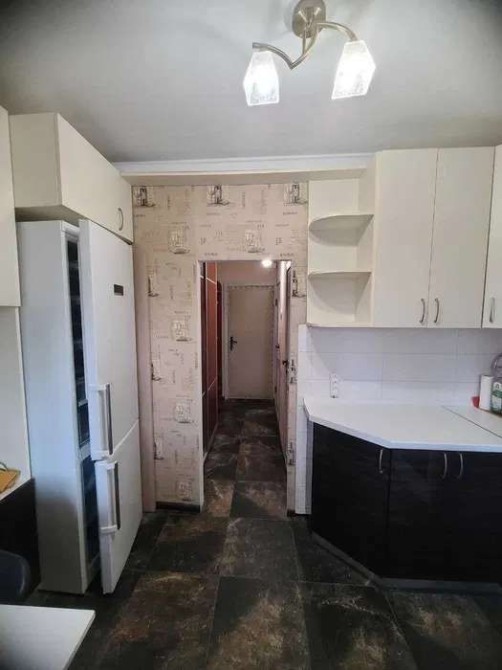 Кухня укомплектована сучасними меблями, є зона для встановлення бутеля для води, та зона для зберігання 1го додаткового. Плита газова, з духовкою є можливість готувати досить делікатні страви накшталт торт "Київський". Холодильник 2х камерний, з суперзаморозкою, є можливість за необхідності витягнути шухляди і використовувати лише полички. Над плитою потужна витяжка з декількома режимами. На лоджії з боку кухні є "продовження" кухні з додатковими секціями для зберігання.