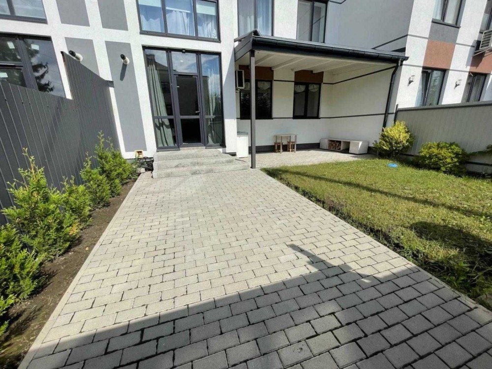 Просторе подвір'я (70 кв.) з власною лаунж-зоною, автоматичні ворота, місце під авто (електромобіль).