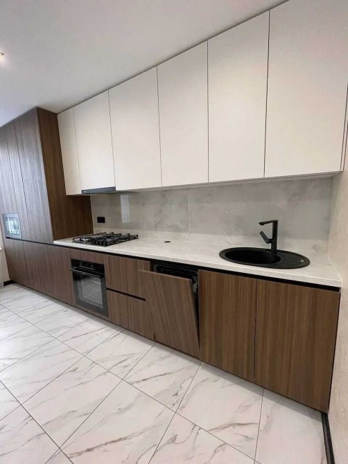 кухня повністю укомплектована технікою: холодильник, мікрохвильова піч, духова піч, газова варильна поверхня, витяжка, посудомийна машина