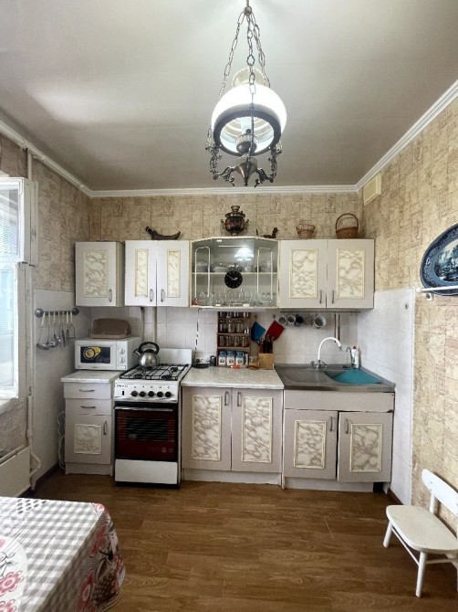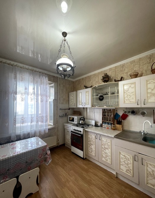 Кухня облаштована всіма необхідними меблями та технікою.