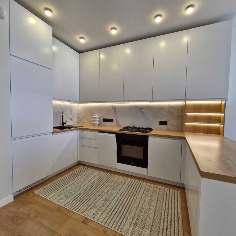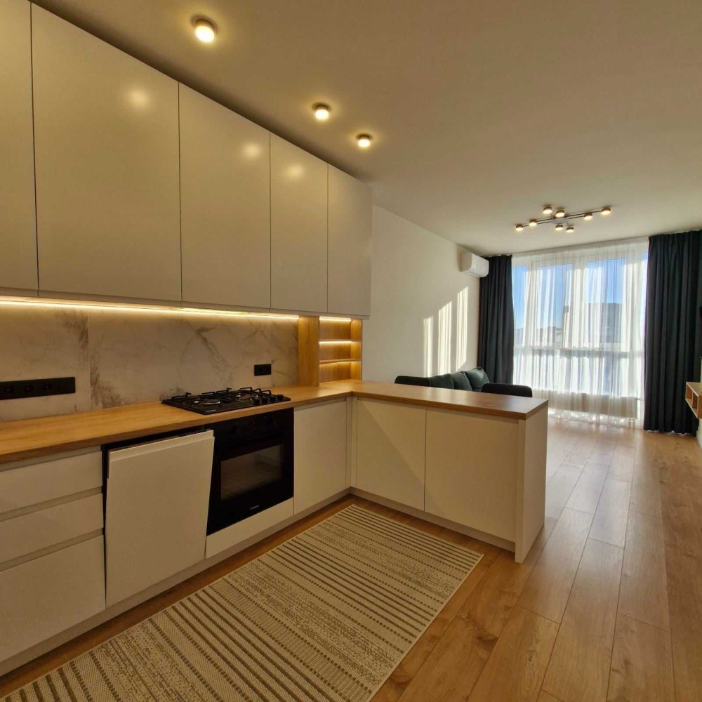 У квартирі простора кухня - студія. Кухня укомплектована повністю - вбудований холодильник, варильна поверхня, духовка, посудомийна машина, мікрохвильова піч.