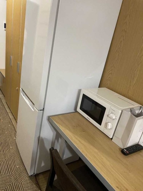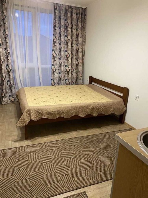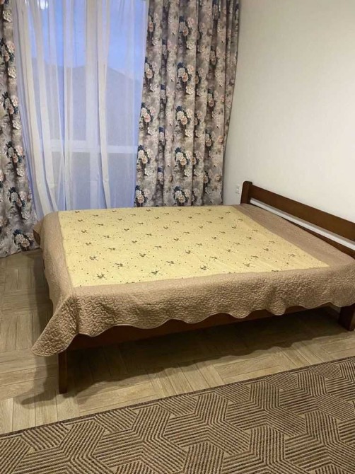 Є все необхідне: двоспальне ліжко + матрац, шафа для зберігання речей, мебльована кухня.