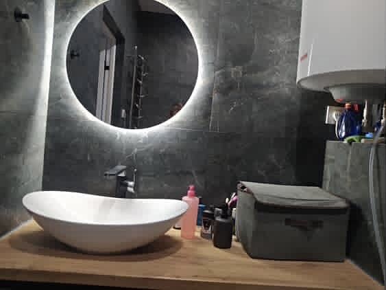 Ванна кімната обладнана ванною, умивальником з тумбою, пральною машиною з сушкою та бойлером.