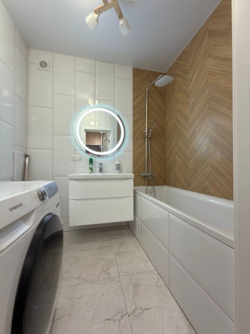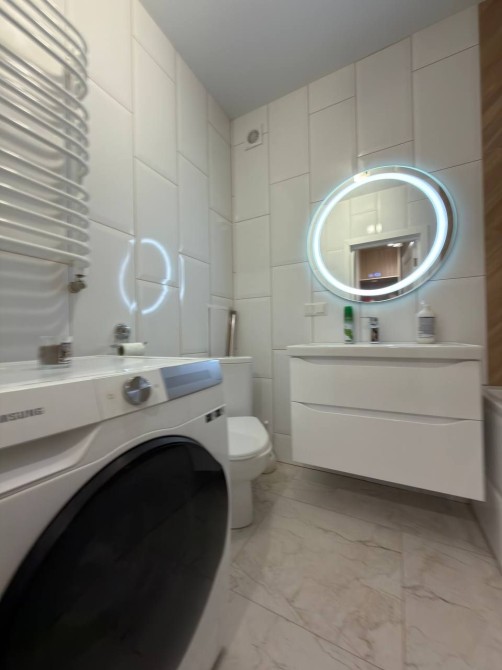 Ванна кімната обладнана ванною, санвузлом, дзеркалом з підсвіткою та пральною машиною.