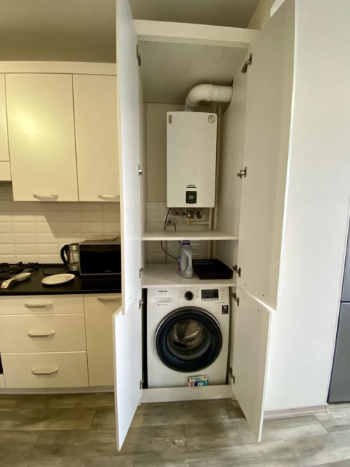 Холодильник, духова шафа, варильна поверхня, витяжка, мікрохвильова піч, чайник, пральна машина, телевізор, Wi-Fi, праска та пилосос (за потреби).