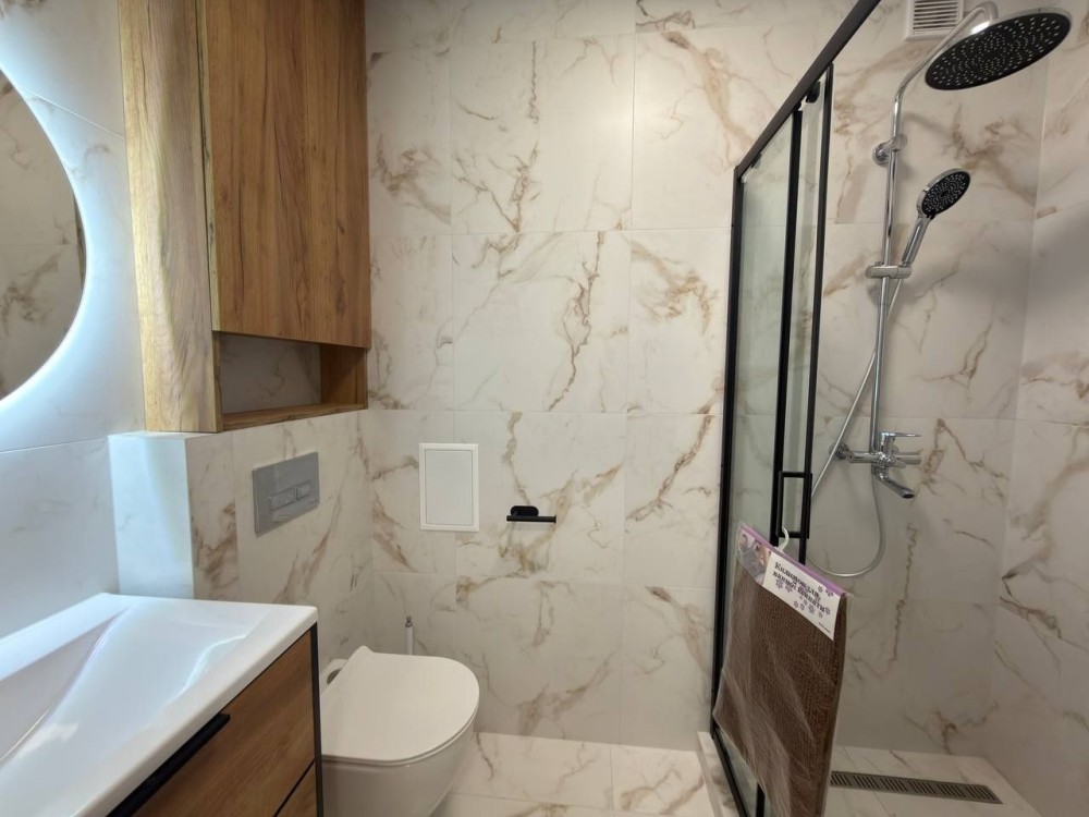 У ванній кімнаті — сучасна душова кабіна, умивальник та дзеркало.