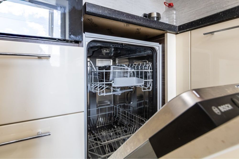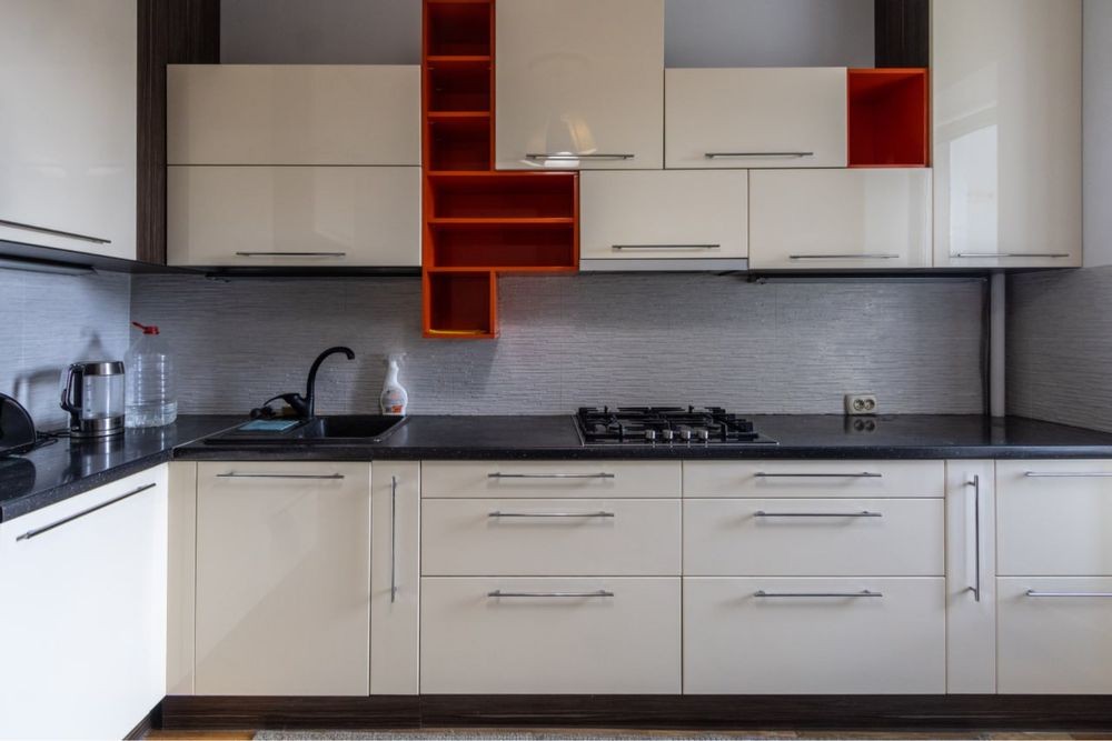 • кухня з сучасними меблями у світло-оранжевих відтінках, обладнана необхідною технікою, включно з посудомийною машиною;