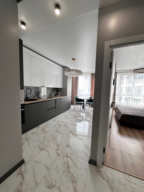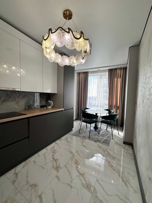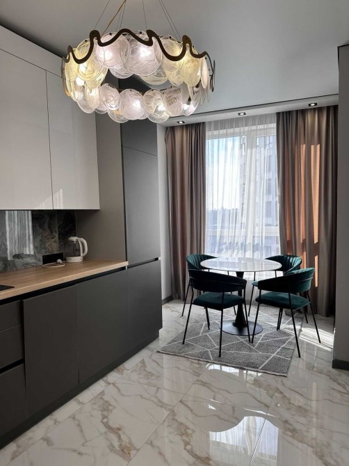 Кухня — справжнє серце квартири. Сучасний гарнітур, ергономічне планування та вбудована техніка роблять її ідеальним місцем для ранкової кави чи приготування вечері в приємній компанії. Обідня зона розташована біля великого вікна, звідки відкривається чудовий вид на динамічне місто.