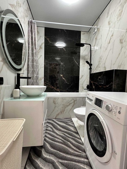 Санвузол оформлений у вишуканих мармурових тонах, де кожна деталь підібрана з любов’ю до комфорту. Якісна сантехніка, містка ванна та стильне дзеркало з підсвіткою роблять цю зону не просто функціональною, а справжнім місцем для релаксу.