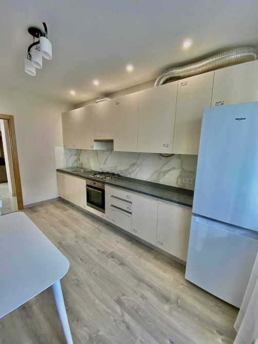 Простора кухня укомплектована необхідною побутовою технікою - варильна поверхня, електрична духовка, посудомийка, холодильник. З кухні вихід на простору засклену лоджію.