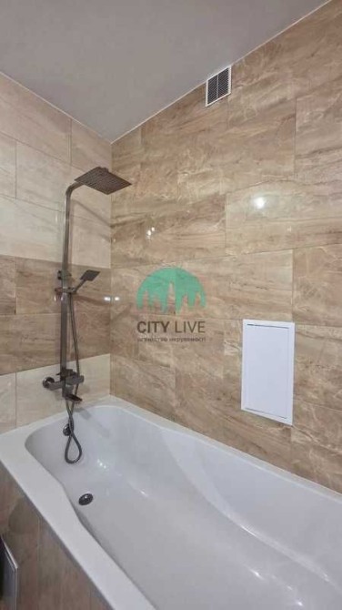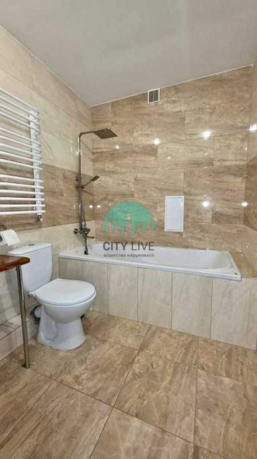 Санвузол суміщений, оздоблений світло-бежевою плиткою під мармур. Встановлена ванна, унітаз та рушникосушка.