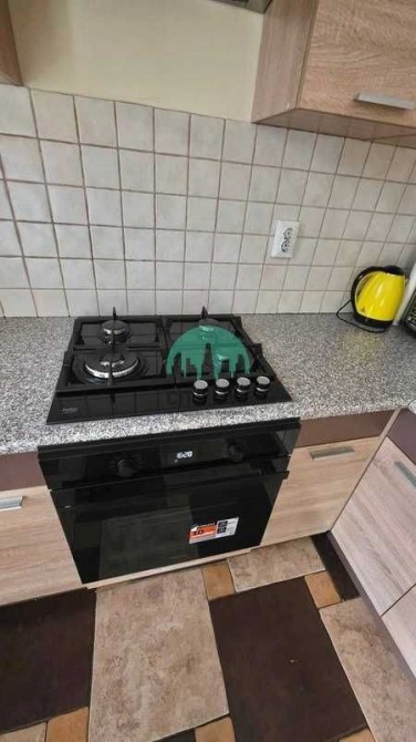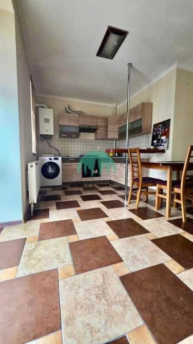 Кухня простора, обладнана навісними та підлоговими шафами. Є газова плита, духова шафа, холодильник, витяжка, пральна машина та газовий котел для індивідуального опалення. Тут же розташована обідня зона зі столом та дерев'яними стільцями.