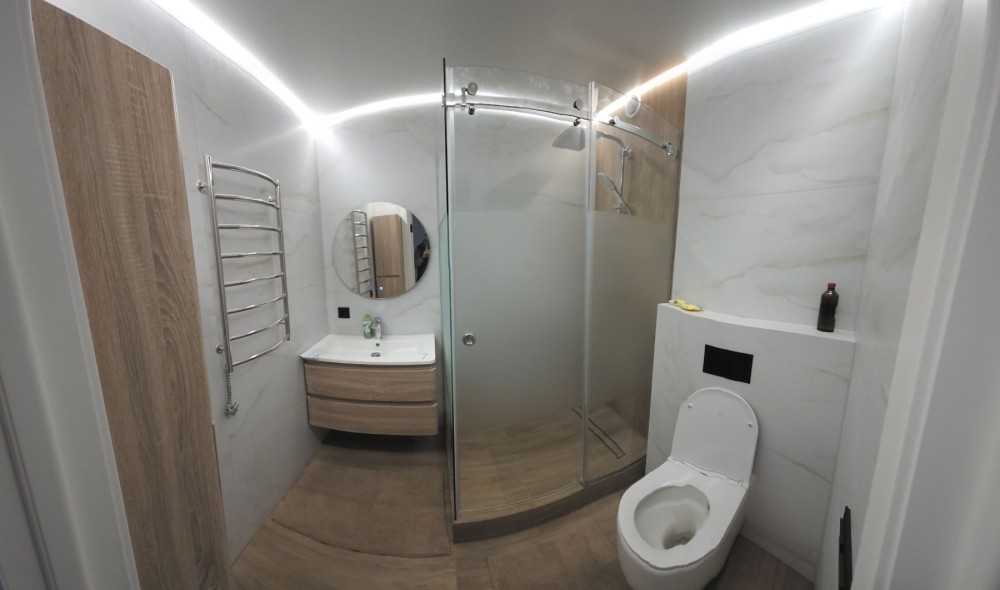 Техніка: пральна машинка, холодильник, телевізор, посудомийка, газова поверхня, духовий шкаф, вмонтована мікрохвильовка.