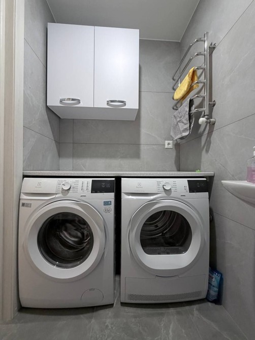 Побутова техніка: вмонтована газова плита та електродуховка, холодильник, пральна машинка, сушильна машинка.