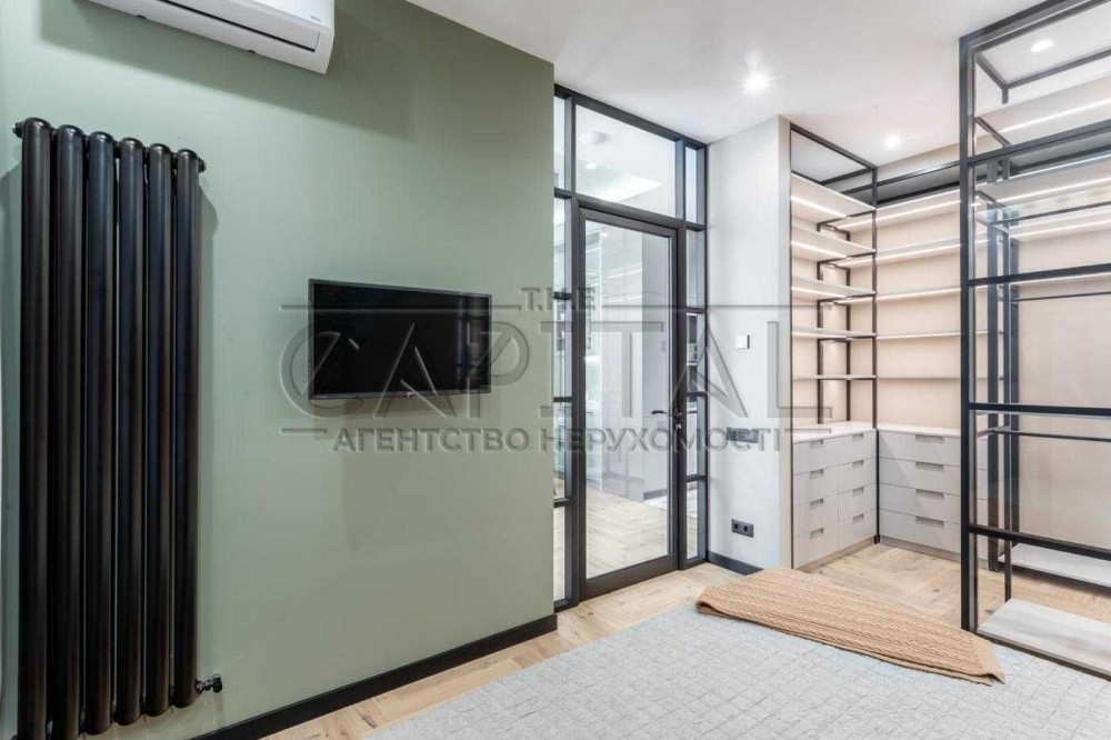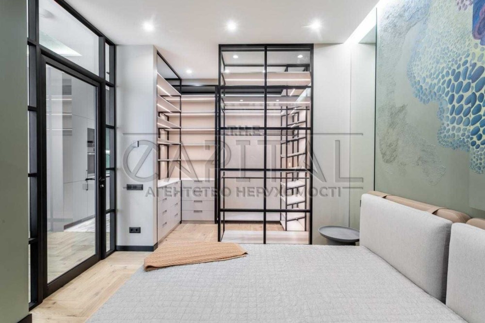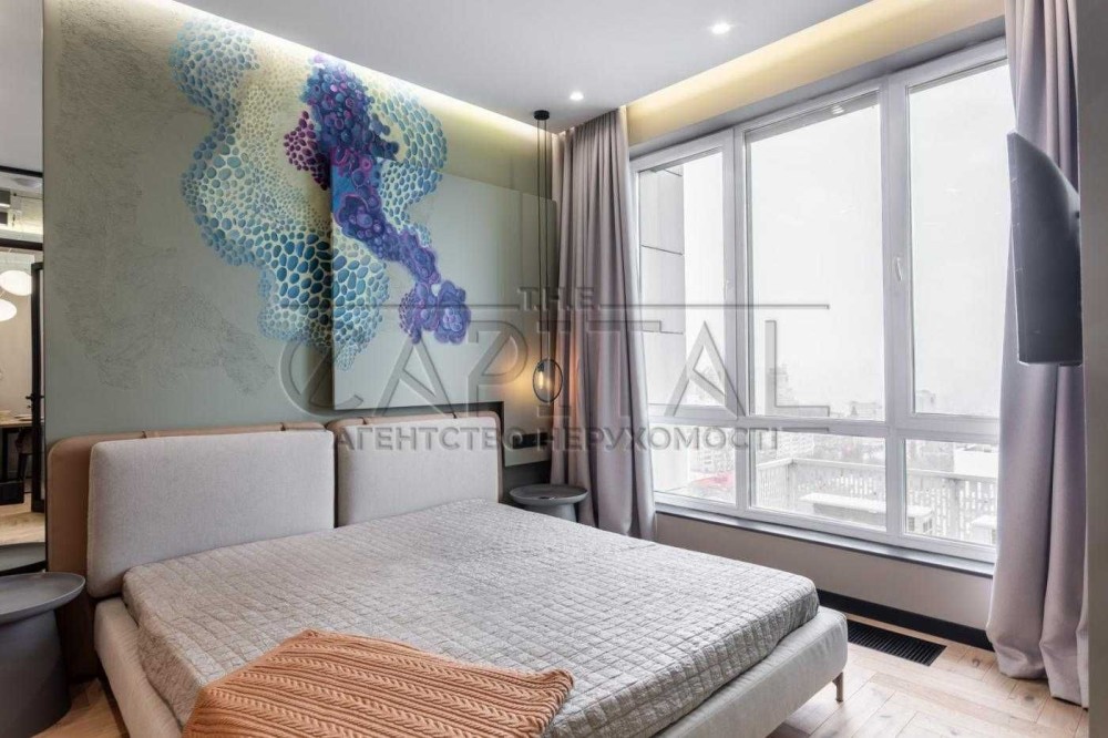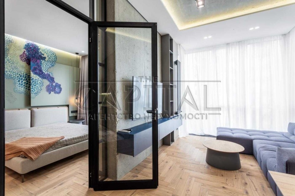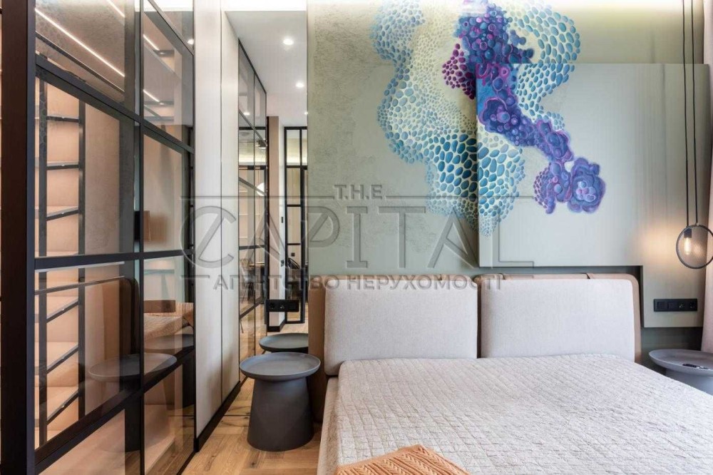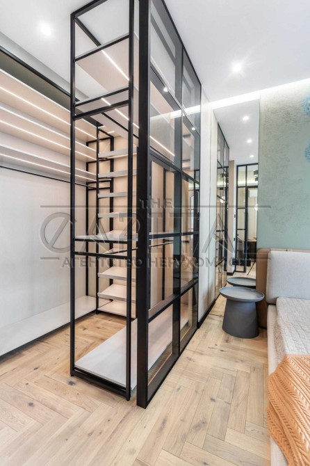 Ця квартира відзначається ексклюзивним дизайнерським ремонтом та має всі зручності для комфортного проживання. У ній є окрема гардеробна, окрема спальня та простора кухня-студія. Спальню та гардеробну розділяє стильна алюмінієва скляна перегородка з підсвіткою.