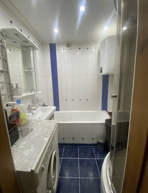 В ванній кімнаті пральна машинка автомат, душова кабінка