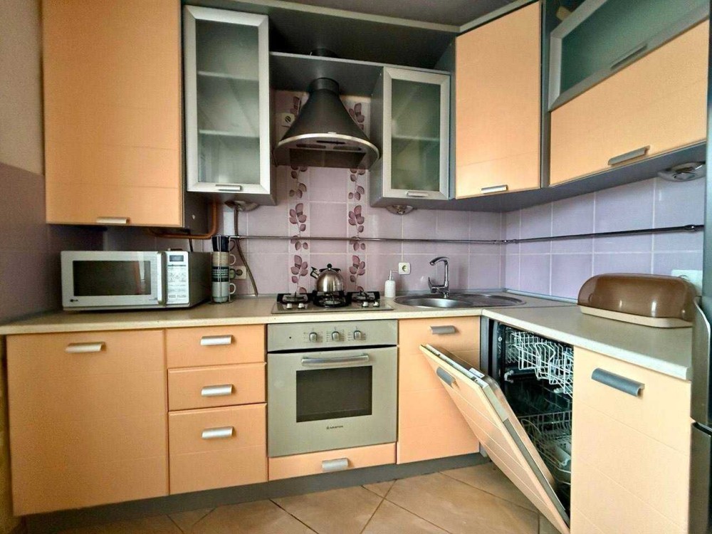Кухня оснащена побутовою технікою, включаючи холодильник, плиту, духовку, мікрохвильову піч, посудомийку.