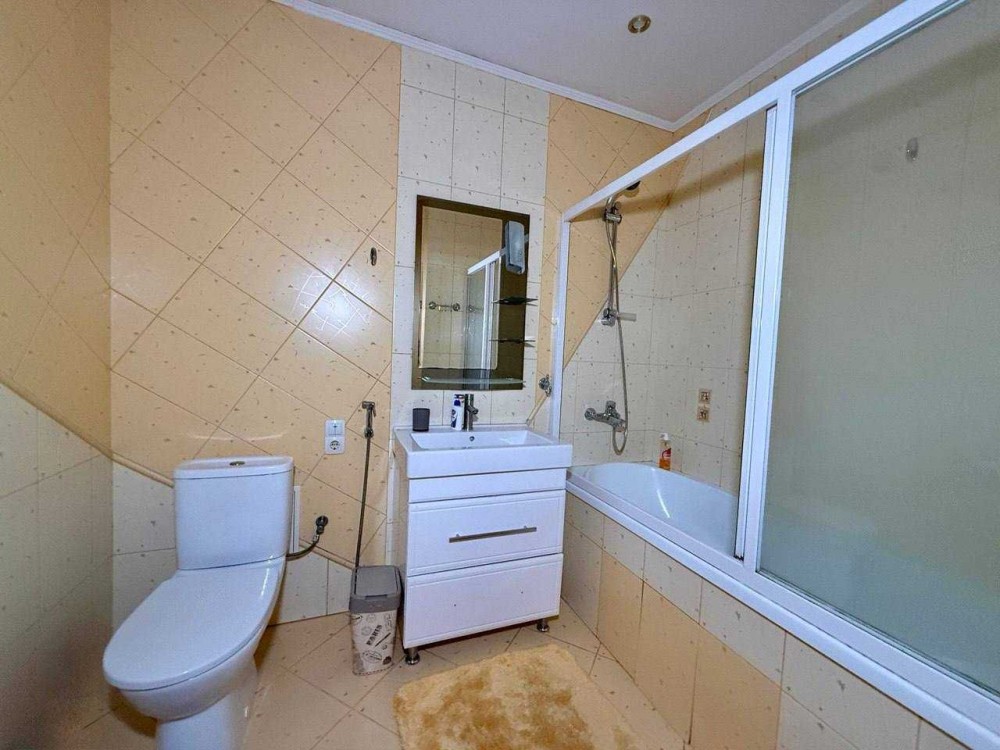 Санвузол виконаний у світлих тонах, є ванна, пральна машина.