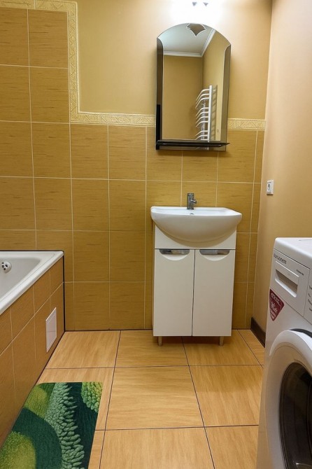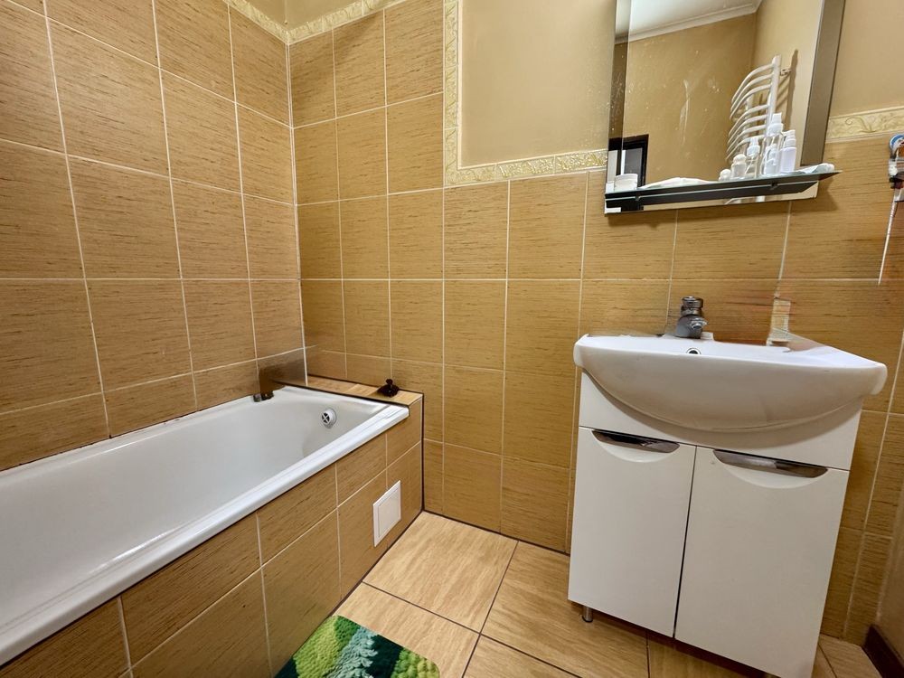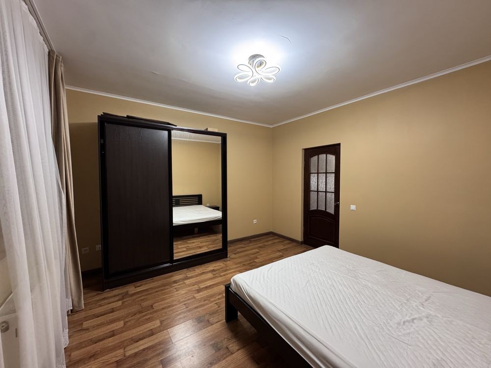 велика спальня з лоджією вкомплектована двоспальним ліжком та шафою для зберігання речей. Друга спальня з таким же наповненням. Роздільний санвузол, ванна кімната з ванною , також вмонтована пральна машина.