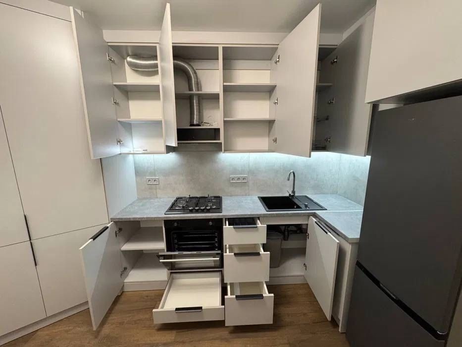 Кухня: вбудована кухня, витяжка, холодильник, газова поверхня, духова шафа.