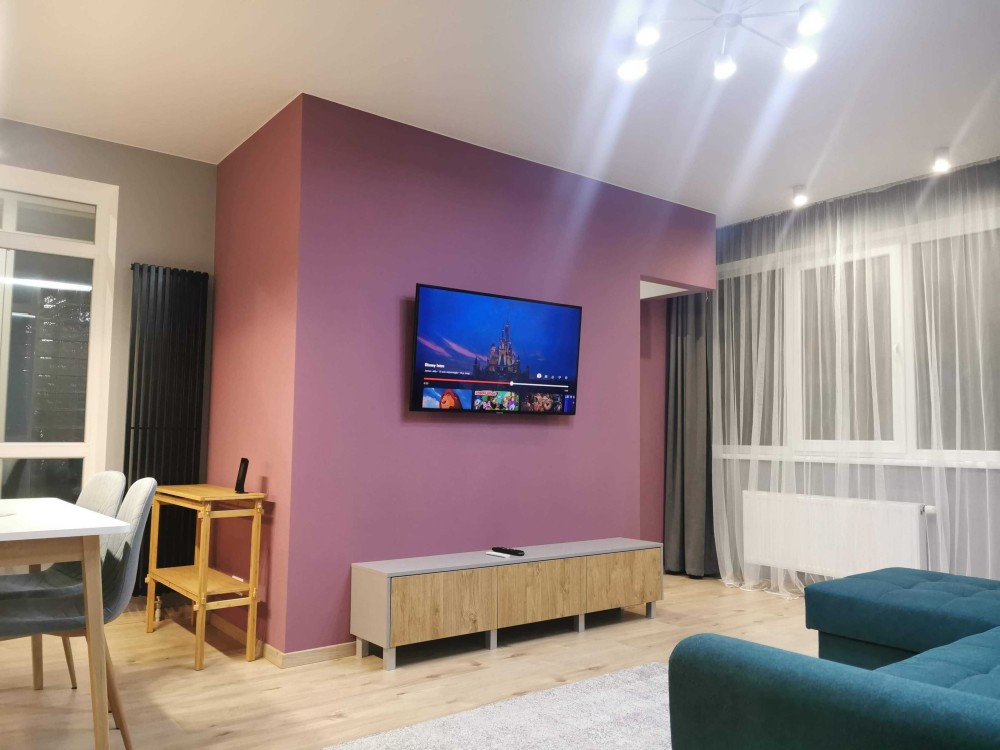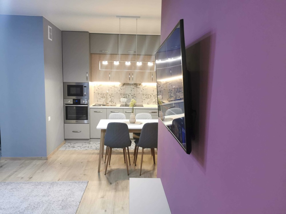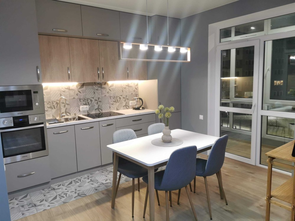 Зона відпочинку двоспальне ліжко + розкладний диван у вітальні. Кухня обладнана індукційною плитою, духовкою та мікрохвильовою піччю.