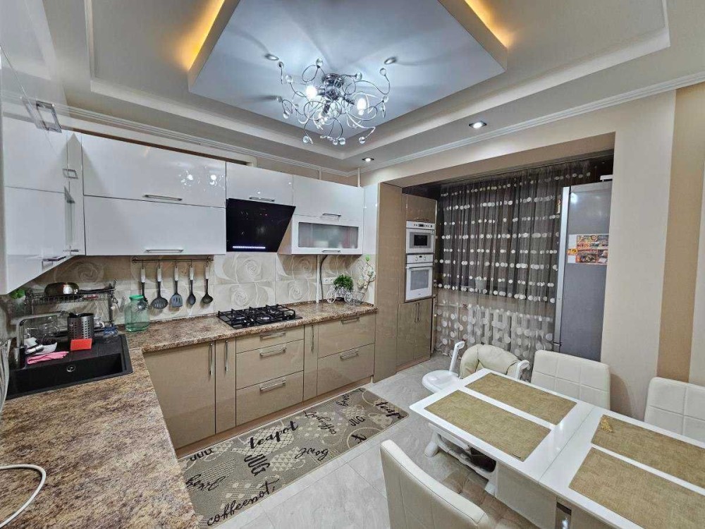 Кухня повністю укомплектована меблями та технікою. Посудомийна машина, мікрохвильова піч та духова шафа,  витяжка, електрочайник, холодильник.