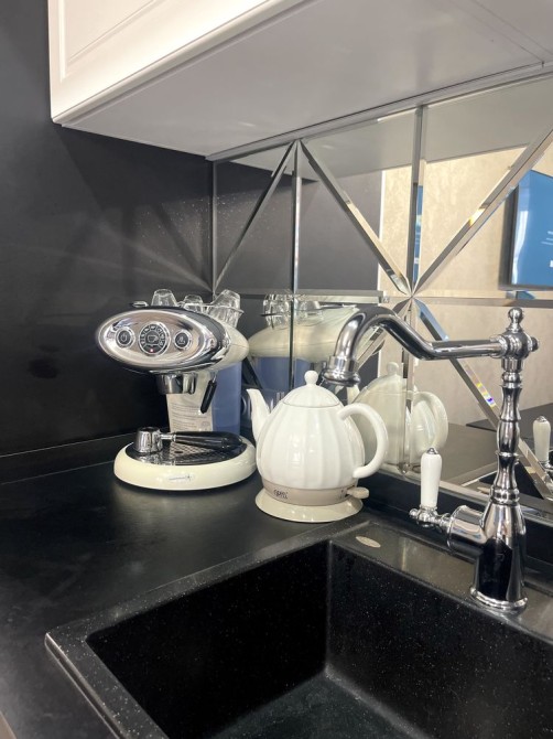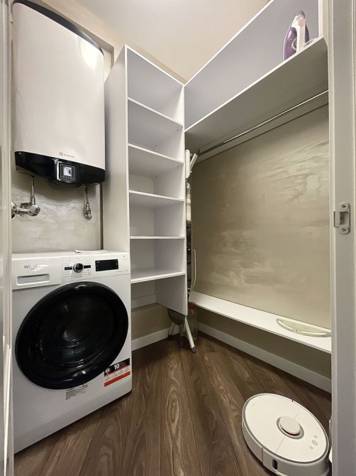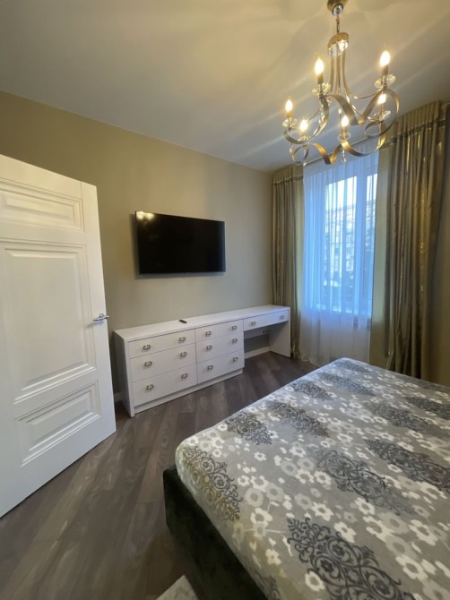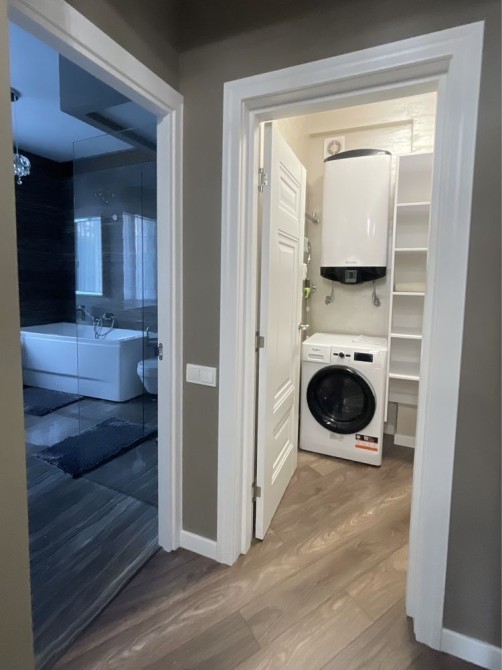 Велика кухня-вітальня та спальня, велике ліжко, гардеробна, пральна машина з функцією сушіння, робот-пилосос , інтернет, сигналізація, кондиціонери, посуд, праска, прасувальна дошка,духовка-мікрохвильовка, кавамашина,ковдра, подушки, постільна білизна,все необхідне для проживання.