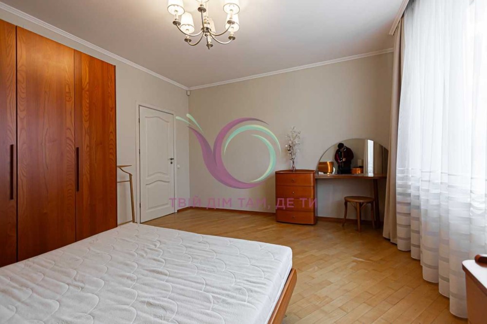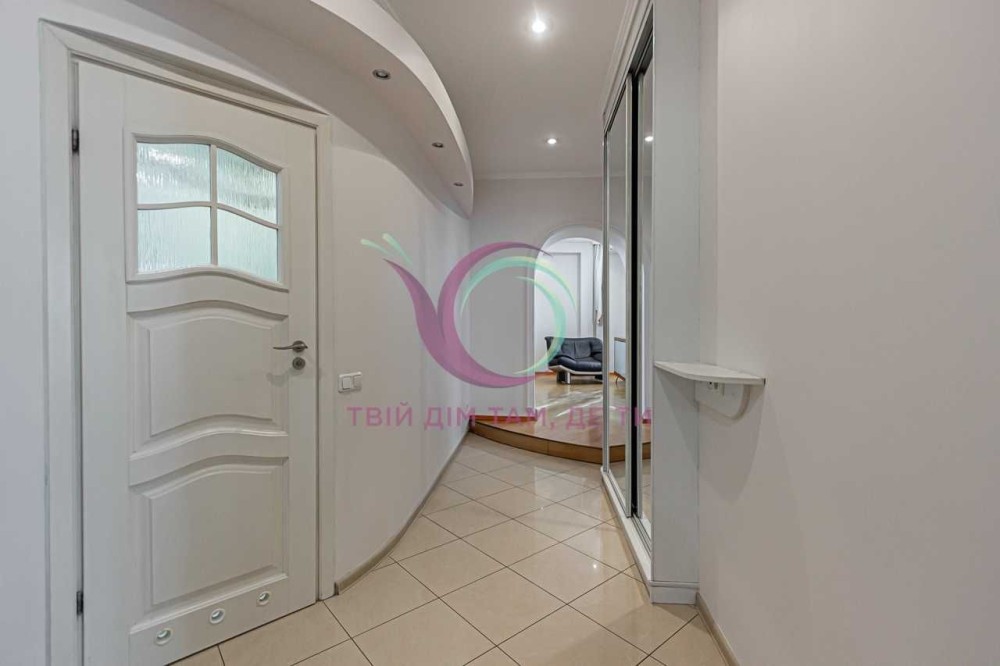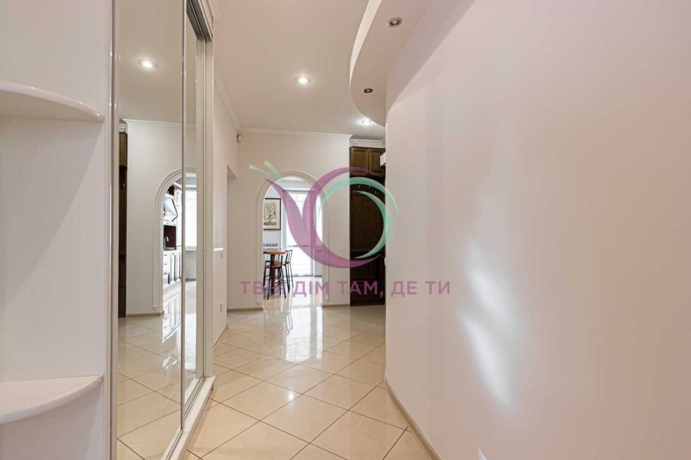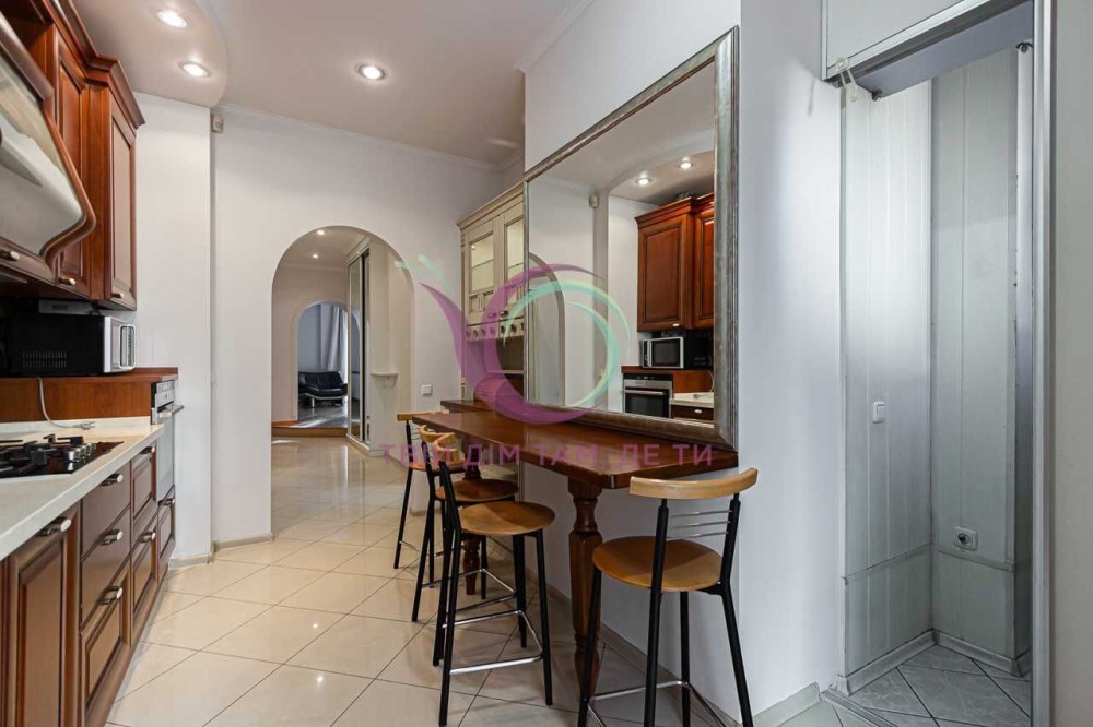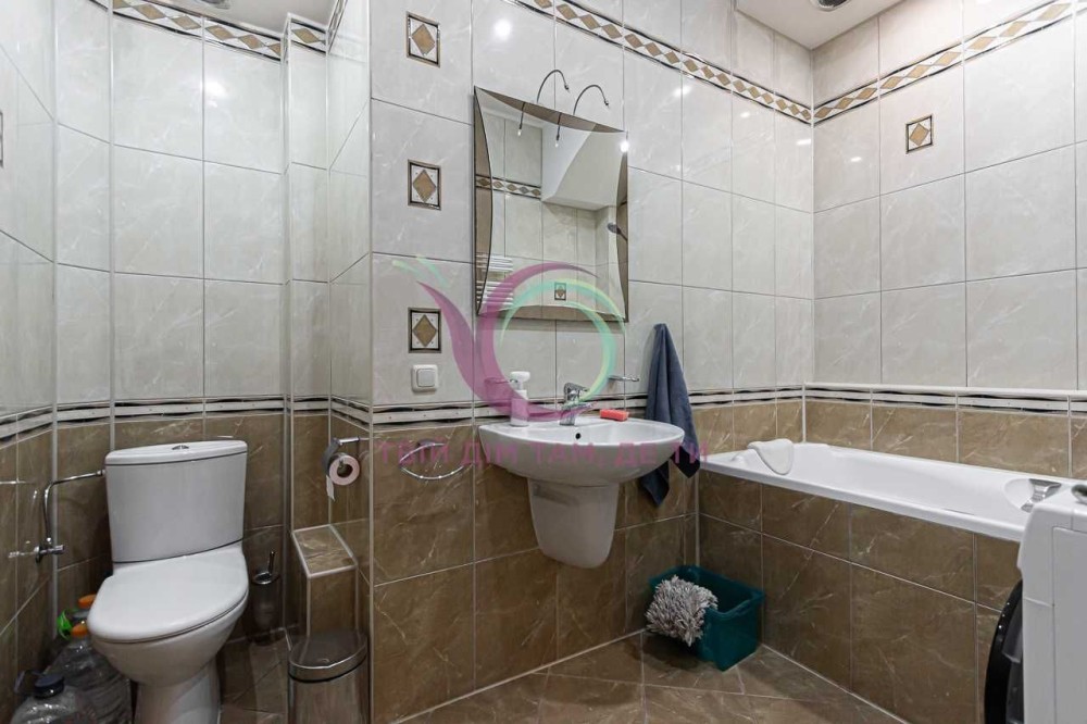 Стильна квартира має роздільне планування, яким передбачено окрему спальну кімнату та кабінет з міжкімнатними дверима, а також мебльовану вітальню для відпочинку з виходом на балкон. Кухня площею 10 м2 має шафи для посуду, холодильник, плиту, посудомийну машину, мікрохвильову піч, духовку, витяжну вентиляцію та зручну обідню зону. Санвузол сумісний, обладнаний ванною та якісною сантехнікою.