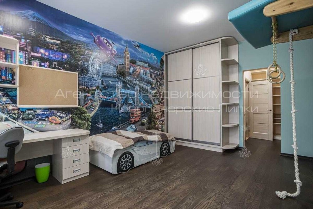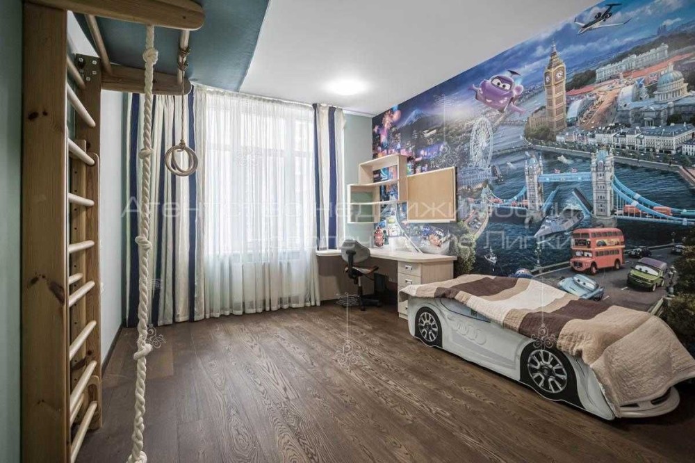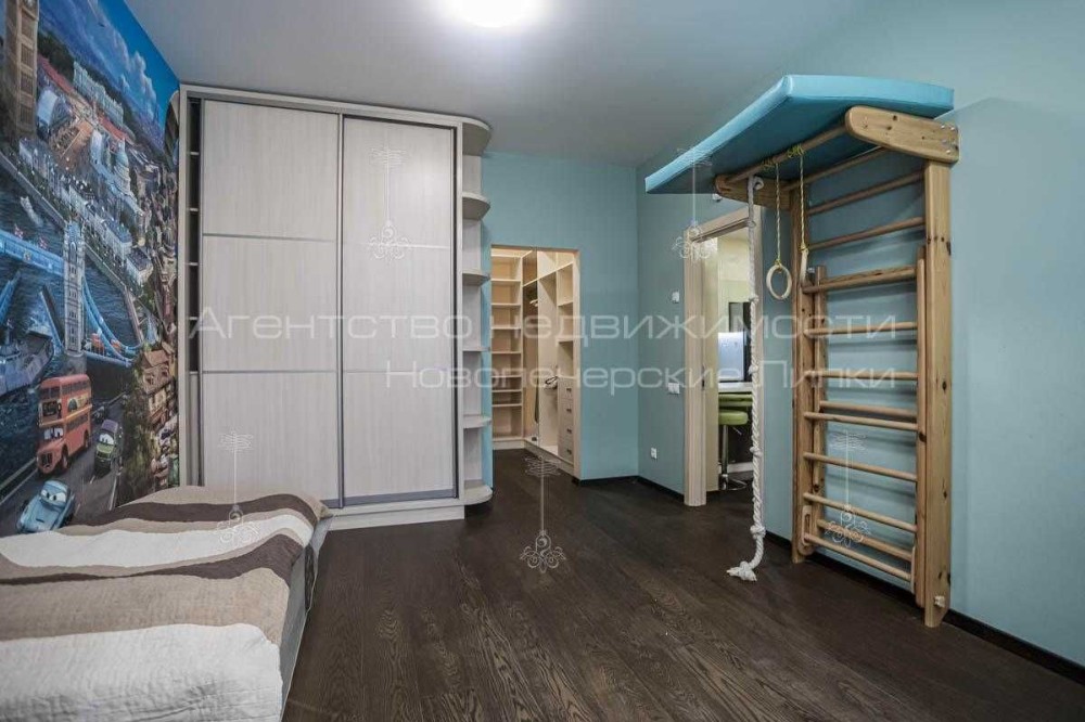 Планировка: кухня-студио, отдельная спальная комната, детская, гардеробная, ванная комната и застекленный балкон.