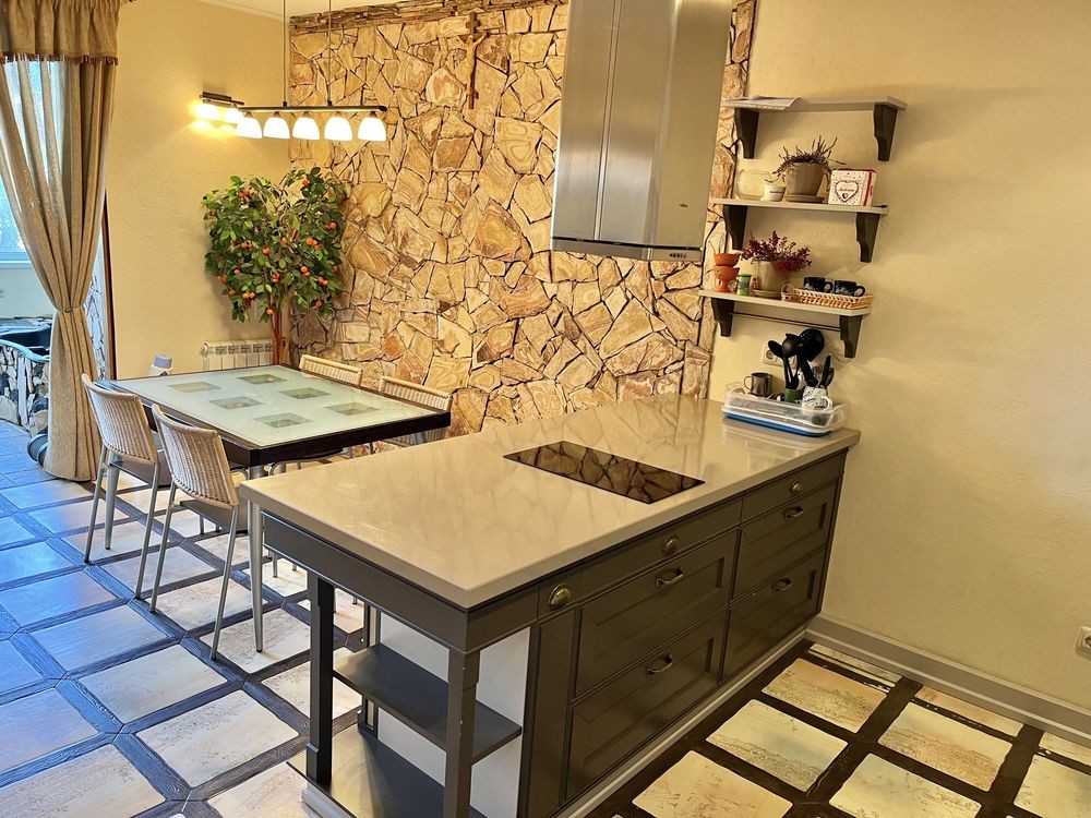 - Вбудована кухня з всією необхідною технікою: фільтр для води, посудомийна машина, духова шафа, мікрохвильова піч, варильна поверхня, холодильник, чайник, витяжка.