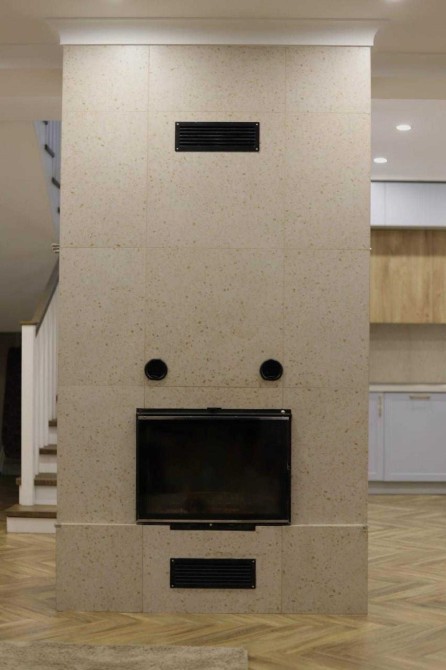 • простора кухня-студія з вітальнею та каміном, який може обігріти увесь дім завдяки системі трубопроводу;
