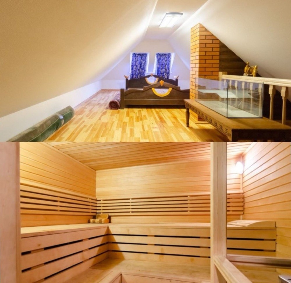 Гостьовий будинок з сауною, кімнатою для відпочинку та спальнею на другому поверсі.