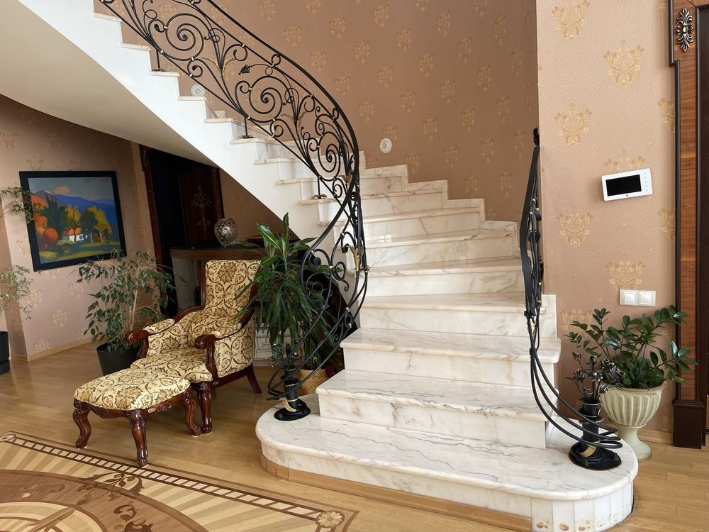 Тереторія дому простора, озеленена, стаціонарний басейн з підігрівом, гаражі для авто, закрита вулиця,відео,місце для проживання охорони.