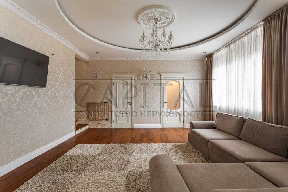 На першому поверсі знаходиться: передпокій зі шафою купе, тумбою для взуття та пуфом, простора вітальня з декоративними нішами у вигляді полиць, кутовим диваном та телевізором, кухня-столова з панорамними вікнами обладнана вбудованою кухнею з технікою та виходом на терасу, господарська кімната (газовий котел, пральна машина, бойлер на 200 літрів, очисна система для води), просторий сан вузол із ванною-джакузі, кабінет з вбудованою до стелі шафою. Відкрита літня тераса з меблями із ротангу.