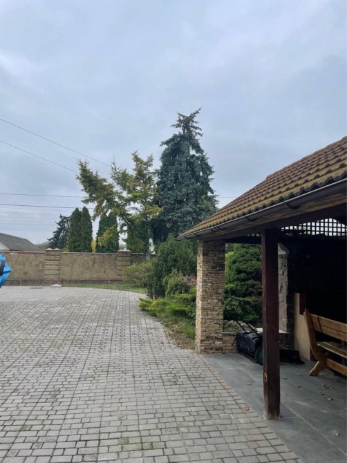 Двір викладений тротуарною плиткою, облаштований газон.