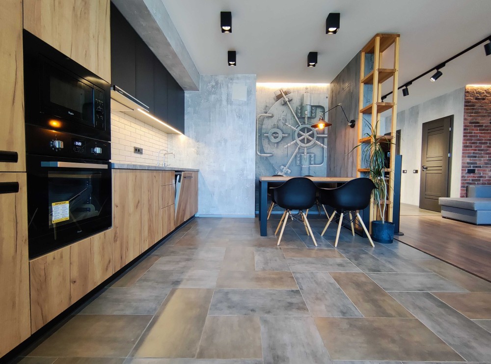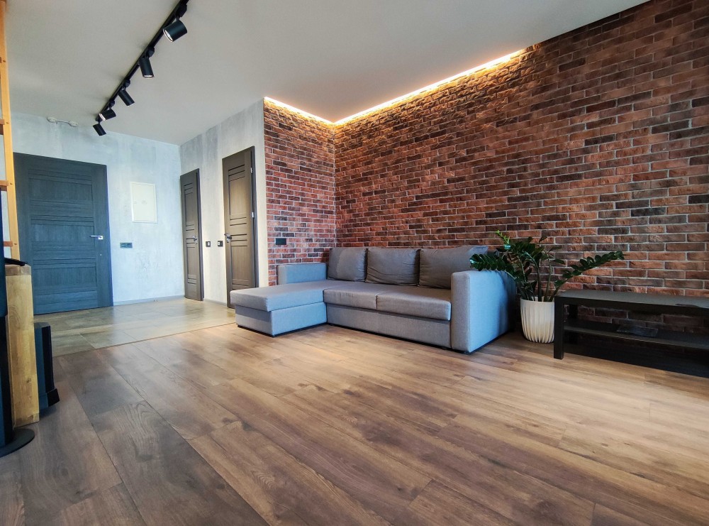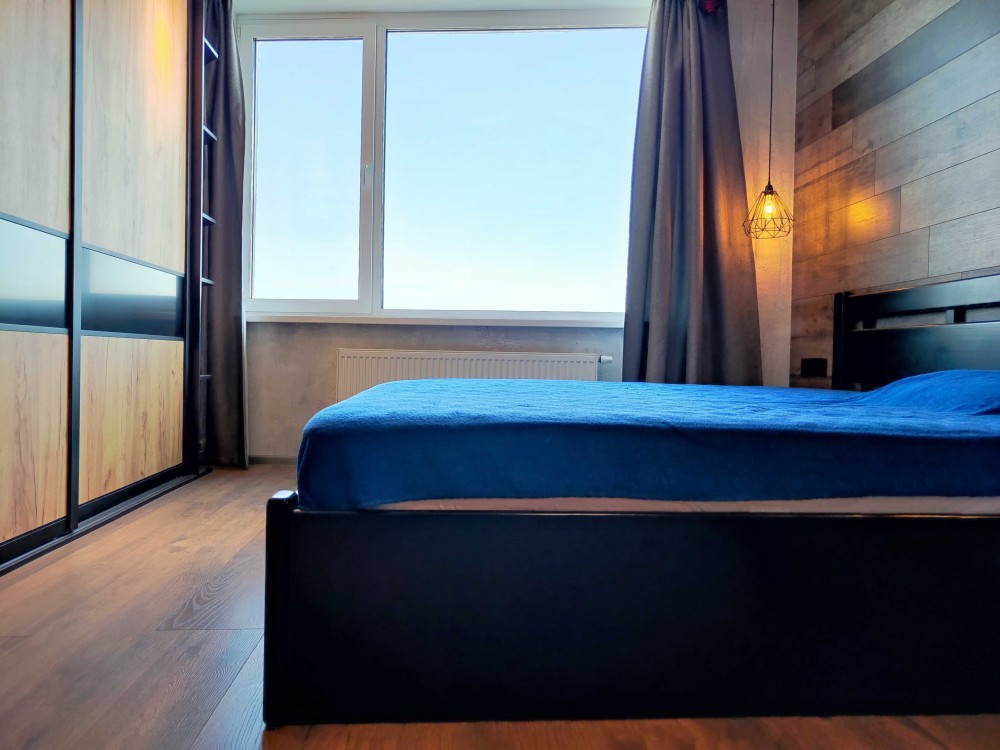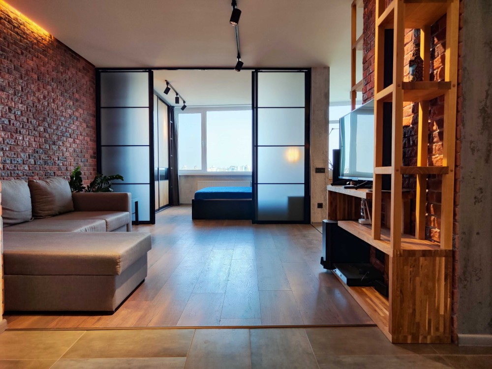 Квартира складається з спальні, кухні-вітальні, санвузла, ванної кімнати, та гардеробної.