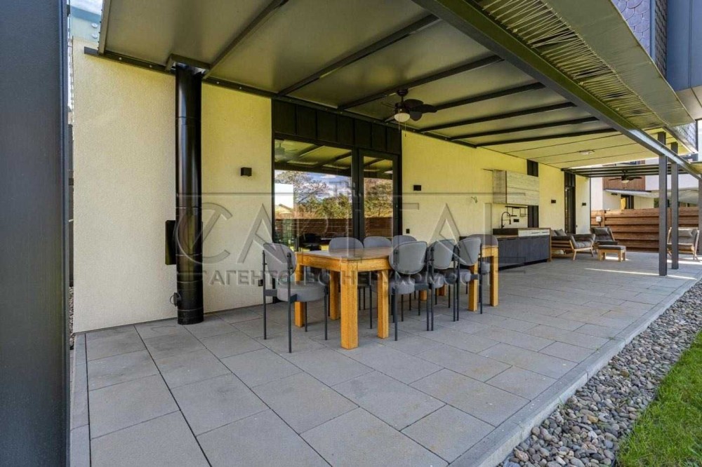 - Хол (23.7 кв.м), велика кухня-студіо з кухонною стінкою, газовою плитою та витяжкою, гостьовий туалет; вихід у внутрішній двір.