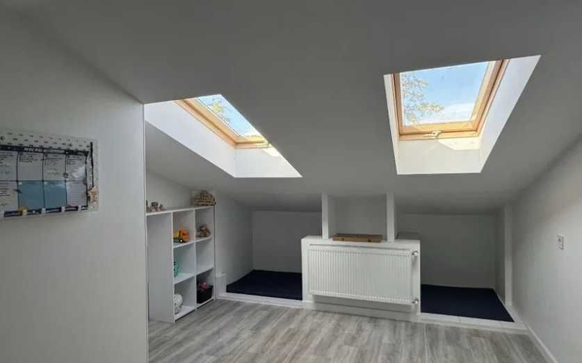 дитяча кімната укомплектована меблями з мансардними вікнами