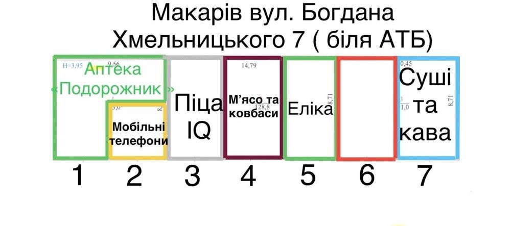На схемі під номером «6». Площа приміщення 45 м2. Нежитлове приміщення, є вода та каналізація. Окремий вхід, місце під рекламу. Групу товарів потрібно уточняти, є обмеження по виду діяльності. Детальніша інформація по телефону. Ціна договірна.