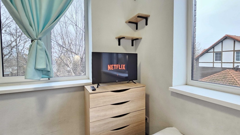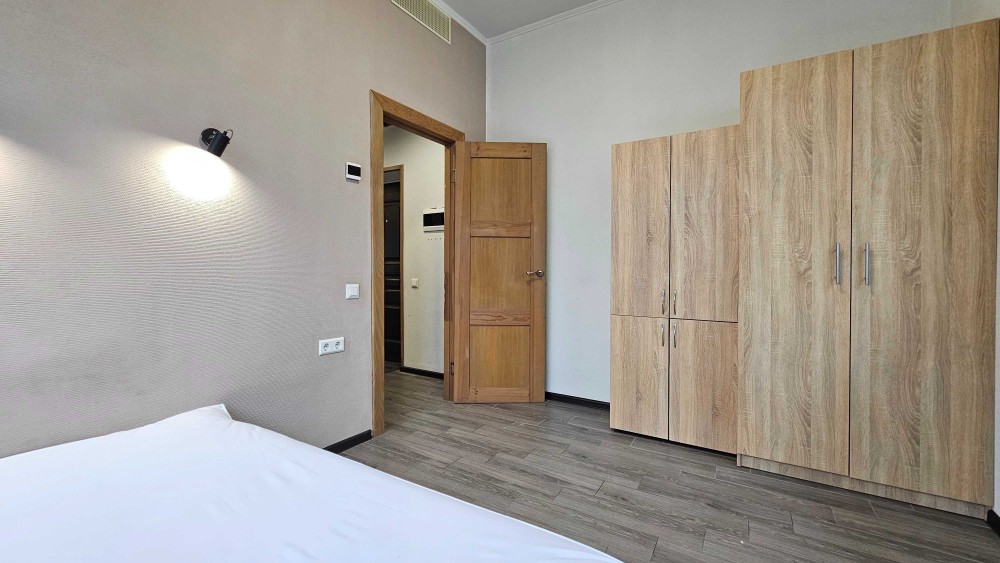 Апартаменти обладнані всіма необхідними меблями та технікою: двоспальне ліжко, шафа, диван, барна стійка зі стільцями, холодильник, електроплита з витяжкою, мікрохвильовка, кавомашина з капучинатором, телевізор, пральна машина, праска, система кондиціювання та вентиляції, тепла підлога.