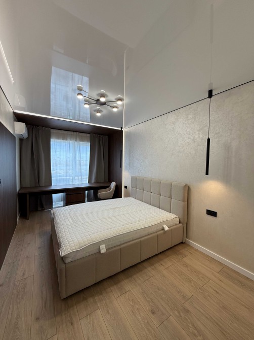 В спальні є з гардероб, якісне двоспальне ліжко, сучасне освітлення, робоче комфортне місце.